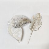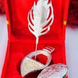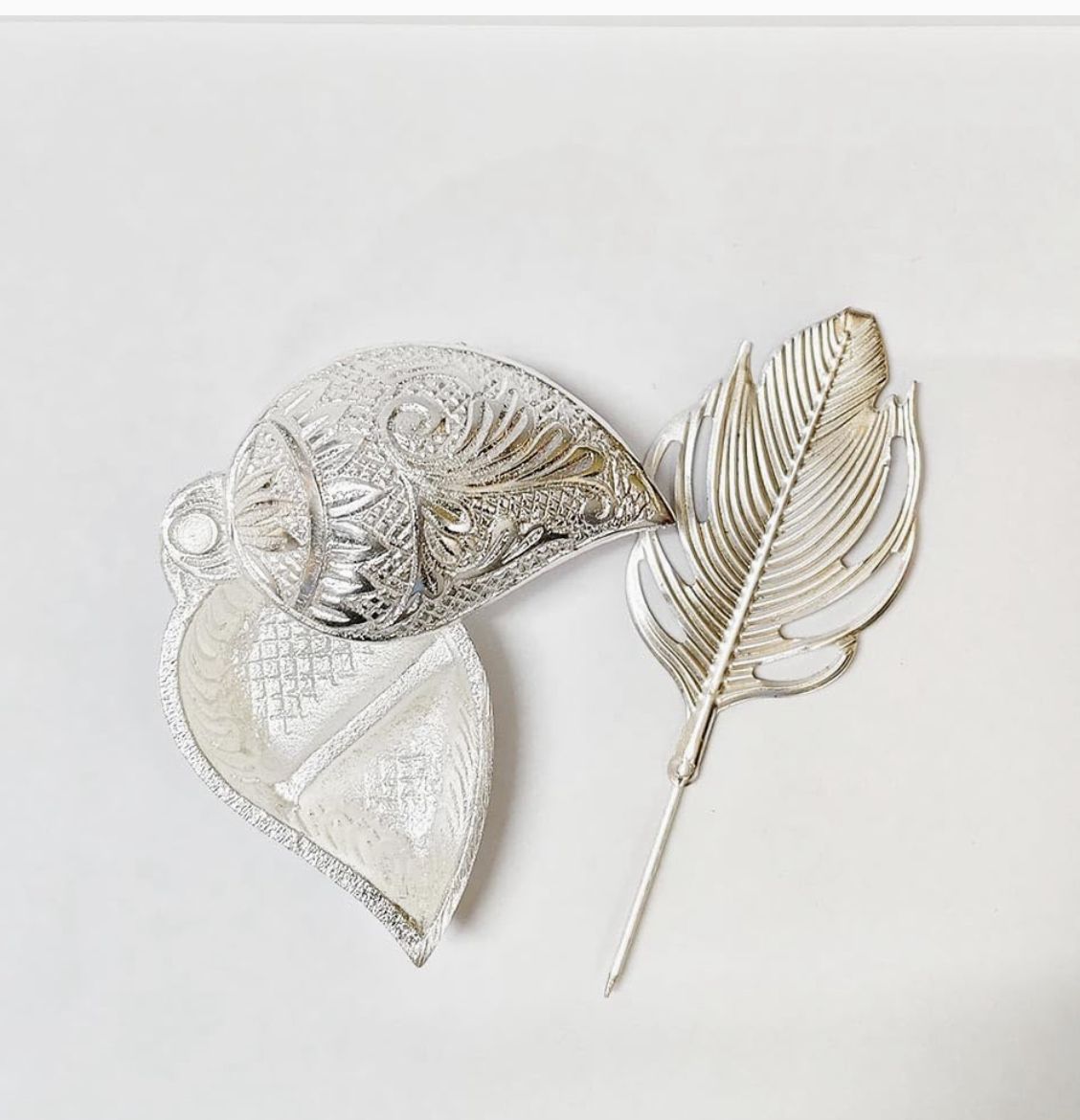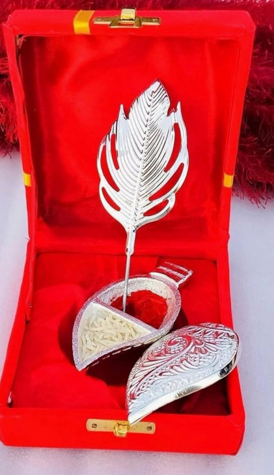 Elegant silver-plated leaf-shaped kumkum–sindoor holder set, beautifully handcrafted with intricate carvings. Perfect for daily pooja use, festive décor, or gifting during weddings, Navratri, and traditional celebrations. The dual-leaf design represents purity and prosperity, adding a divine charm to your altar or dressing table. Comes in a luxurious red velvet box for gifting.